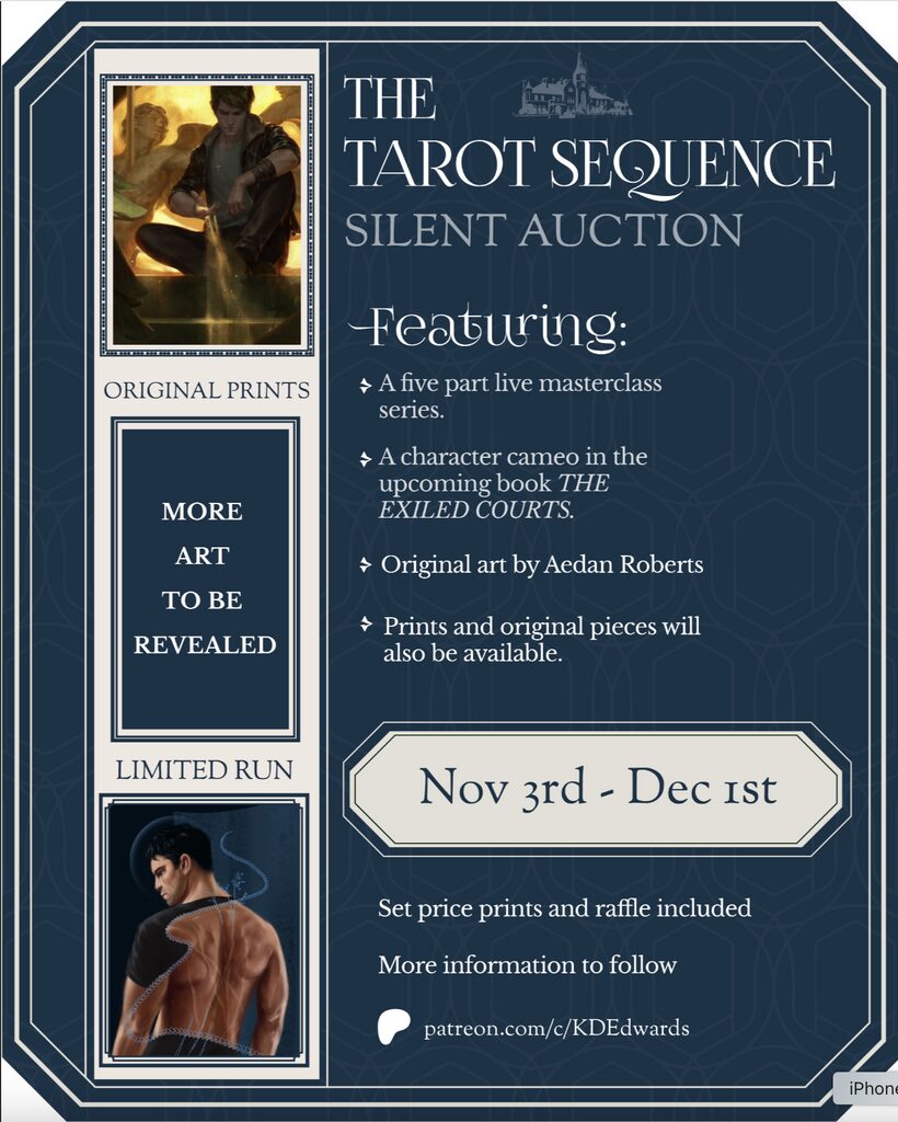 The Silent Auction is a special fundraising event to support my transition into full-time writing and prepare for the next two volumes of The Tarot Sequence and other upcoming projects. It features a selection of items and experiences donated by me and my friends/collaborators—everything from signed books and original artwork to one-on-one writing sessions and behind-the-scenes collectibles. Every winning bid directly helps fund my writing expenses: cover art, copyediting, PR and design, and creative development for future jewelry and symbols set in the Tarot world.